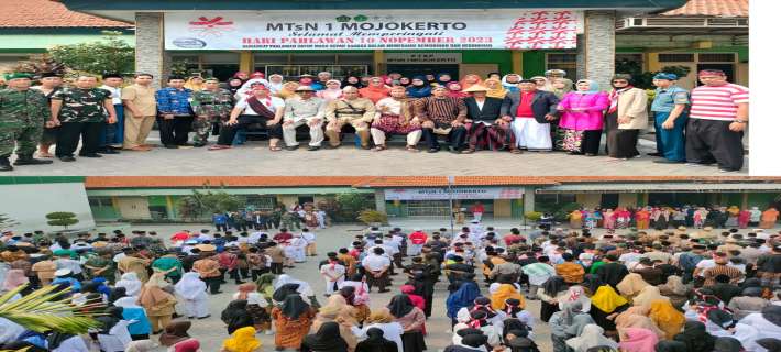 Kab. Mojokerto Jatim (MTsN 1 Mojokerto). Tepat pukul 07.00 WIB, seluruh peserta didik beserta guru dan tenaga kependidikan (GTK) MTsN 1 Mojokerto melaksanakan upacara Peringatan Hari Pahlawan. Peringatan Hari Pahlawan...