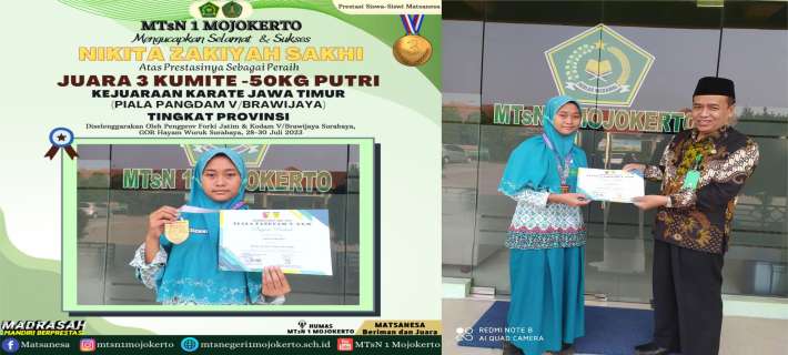 Kab. Mojokerto Jatim (MTsN 1 Mojokerto). Pada Kamis, (3/8) tahun 2023, duta Karate MTsN 1 Mojokerto menyerahkan piagam dan medali ke madrasah. Duta karate yang berhasil meraih juara 3 Kumite...