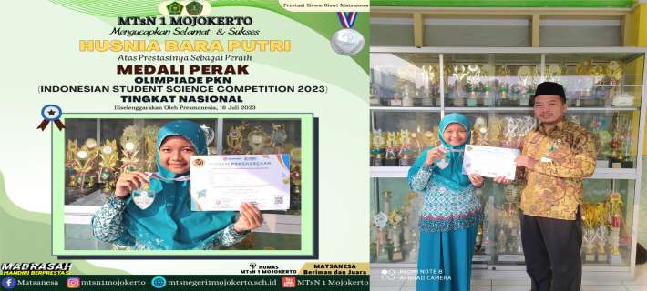 Kab. Mojokerto Jatim, (MTsN 1 Mojokerto). Pada Kamis, (3/8) tahun 2023, Husnia Bara Putri peserta didik MTsN 1 Mojokerto menyerahkan piagam dan medali perak kepada madrasah. Ajang Olimpiade Sains Tingkat...