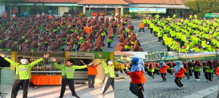 Kab. Mojokerto Jatim, (MTsN 1 Mojokerto). Berdasarkan program kerja madrasah, pada Jumat, (28/7) tahun 2023, Seluruh peserta didik kelas VII, VIII, IX, dan GTK MTsN 1 Mojokerto bersemangat mengikuti senam...