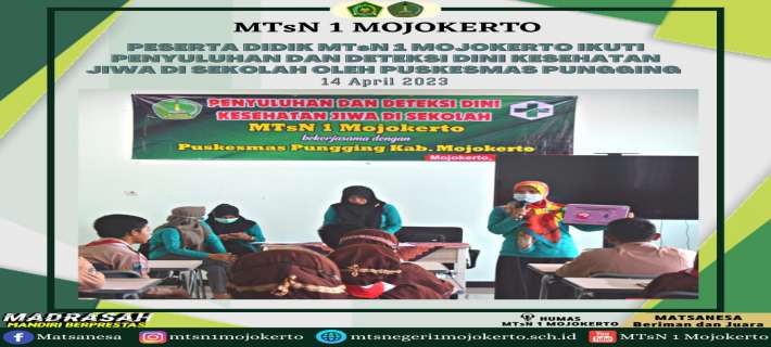 Kab. Mojokerto Jatim, (MTsN 1 Mojokerto). Berkaitan dengan program kerja UKS, anggota PMR, OSIS, dan kader UKS mengikuti Penyuluhan & Deteksi Dini Kesehatan Jiwa di Sekolah. Kegiatan ini terselenggara berkat...
