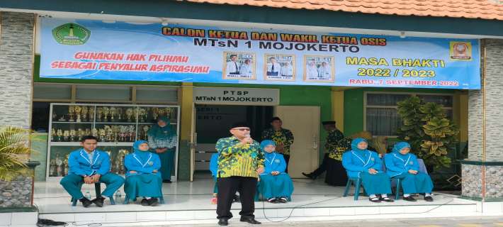 Kab. Mojokerto Jatim, (MTsN 1 Mojokerto). Berdasarkan program kerja madrasah, pada Rabu, (7/9) tahun 2022 pemilihan ketua dan wakil ketua OSIS masa bakti 2022-2023 dilaksanakan. Ada tiga kandidat...